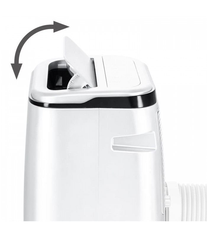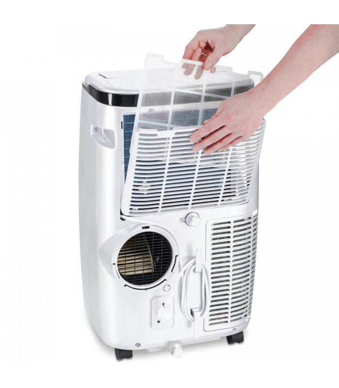 Osim toga, kompaktni multitalent ima integrirani ventilator s 3 stupnja puhanja. S volumenom zraka do 340 m³/h, to osigurava cirkulaciju zraka i svjež vjetar u prostoriji – čak i bez aktiviranja kompresora za hlađenje. Po želji možete uključiti funkciju njihanja kako biste ravnomjerno rasporedili protok zraka po prostoriji. Za filtriranje vlakana, pahuljica prašine i dlaka kućnih ljubimaca iz zraka koji se udiše, na stražnjoj strani uređaja integriran je filter zraka koji se lako čisti.